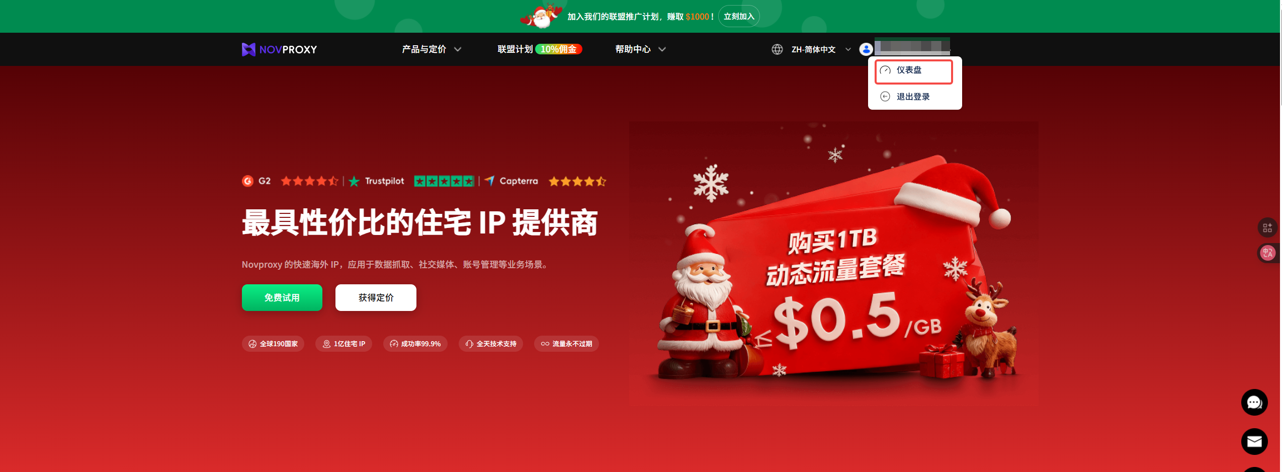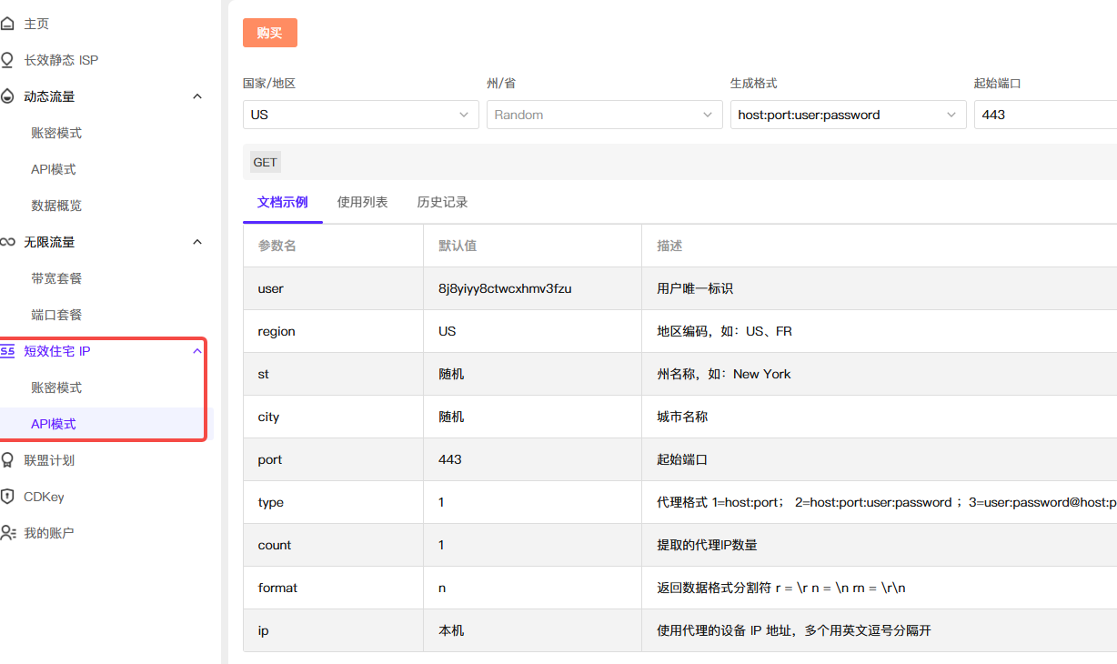 1、进入操作台(Dashboard)，点击菜单短效住宅IP-API模式