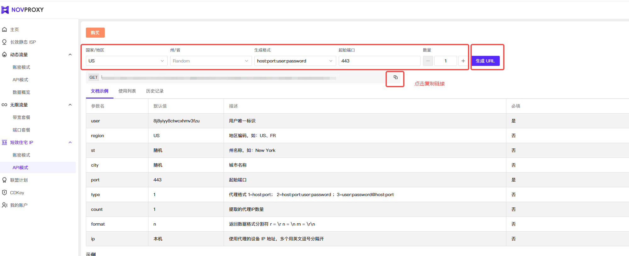 2、选择需要的国家/地区、州省、生成格式、输入起始端口、选择数量后，点击生成URL按钮，再点击复制按钮，即可复制链接使用